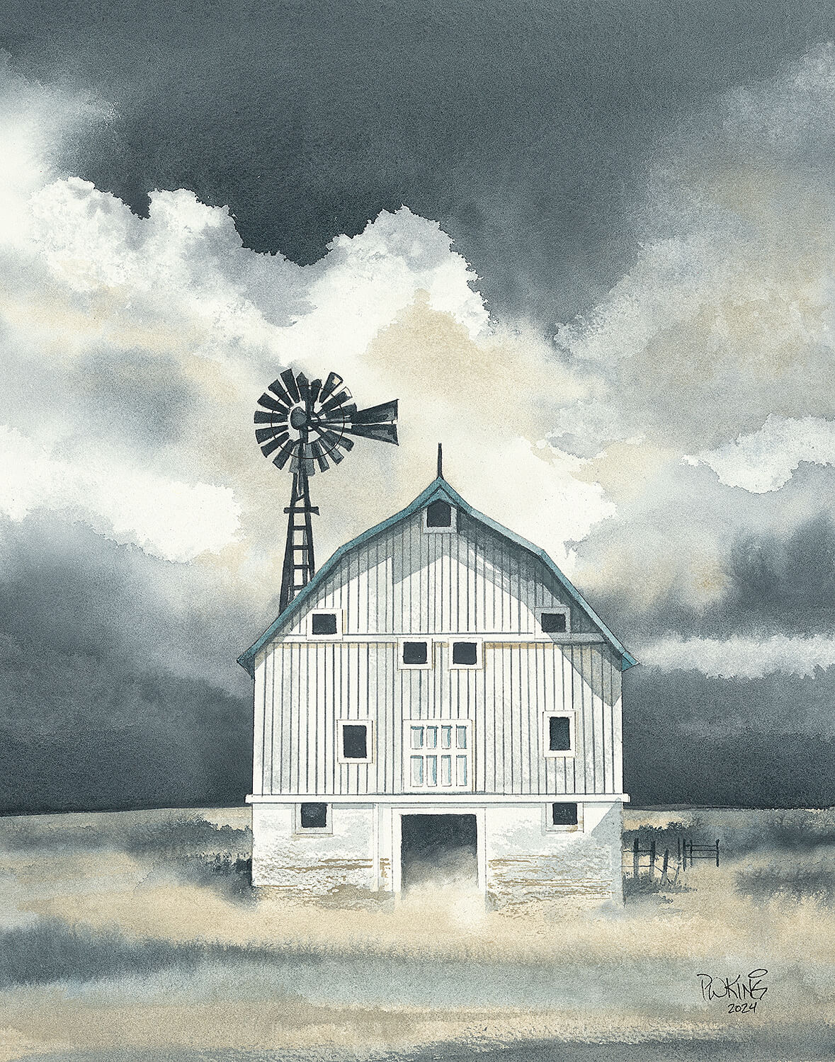StormCloud. Hand-painted watercolor of a white gambrel barn located in Kane County, Elburn, Illinois in 1920.